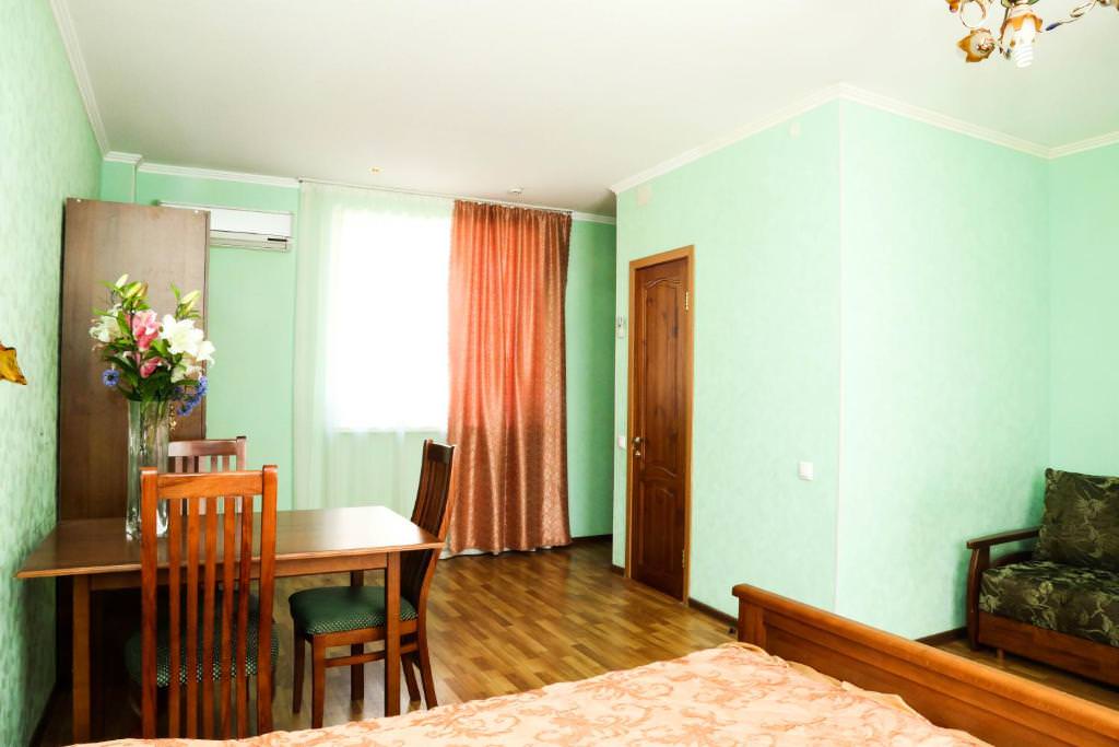 Площадь номера - 30 кв.м. 2 осн. места. 2 доп. места. Мебель: диван раскладной, кровать двуспальная, прикроватные тумбочки, стол, стулья, шкаф. Оборудование: кондиционер, телевизор, холодильник, электрочайник. Санузел: с душем, фен. Сервис: смена полотенец, смена постельного белья, уборка номера.